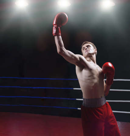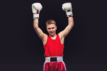 Happy young handsome boxer sportsman in red boxer suit and white gloves standing on black backgound. Winner. Copy space.
