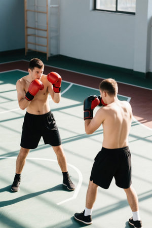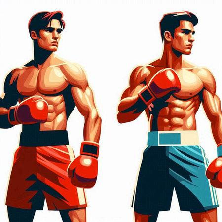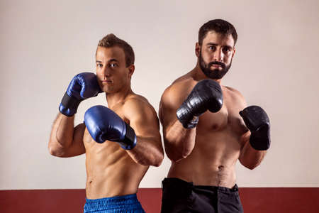 Muscular boxers in boxing gloves are ready for fight.