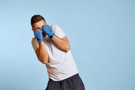 sporty man in blue boxing gloves and t-shirt on blue background practicing punches cropped view