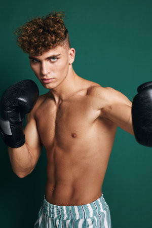 Young male boxer with curly hair wearing black gloves and striped shorts posing in fighting stance against green background for fitness and sports training.