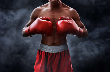 Professional young black boxer with bare torso wearing red gloves, ready for fight in neon lighting. Professional sports