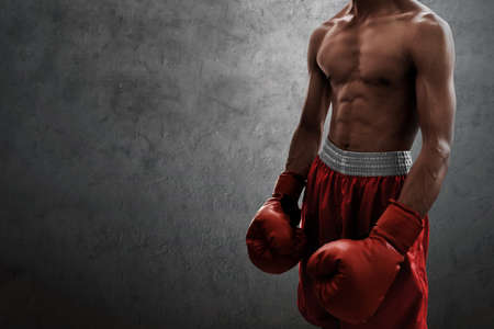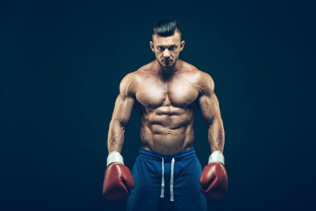 close up of muscular sport boxer man with naked torso abs in gym