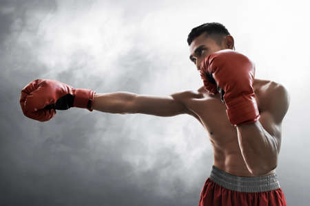 Man is hitting an opponent. Focused fighter with naked torso and boxing gloves looking at the camera. Win.