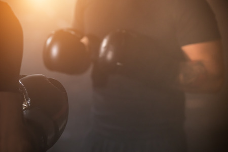 Detail of men boxing gloves during training lesson. Dark industrial fitness workout interior with cinematic atmosphere. Active sport and healthy lifestyle.