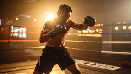Portrait of a mixed-race boxer in the ring at night