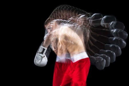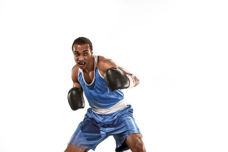 Sporty man during boxing exercise. Photo of boxer on white background