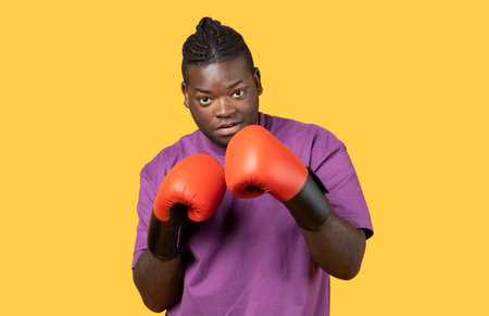 Confident young black boxer man wearing boxing gloves, yellow background