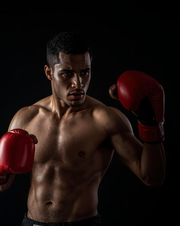 A trained boxer stands with a focused expression, ready for action. He wears red boxing gloves and shows defined muscles. The dramatic lighting highlights his intense concentration during the workout.