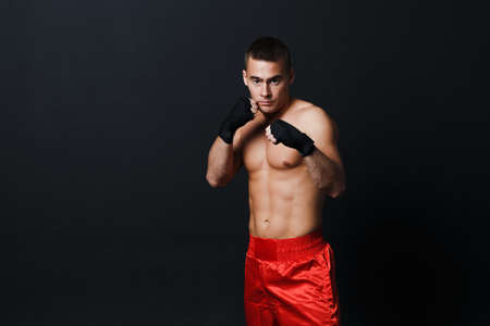 Sportsman muay thai man boxer stance in red truncks at black background