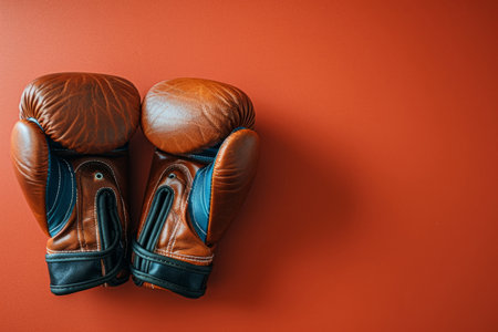 Pair of brown leather boxing gloves lying on red surface
