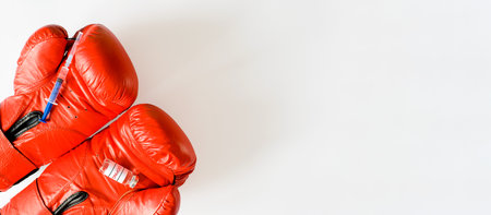 Syringe and dope ampoule on red boxing gloves. Banner, copy space. Doping, pharmacology and sports concept.