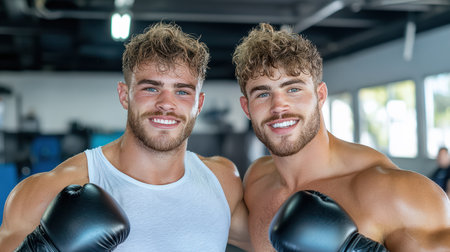 A Two smiling men with boxing gloves in gym, showcasing camaraderie and fitness