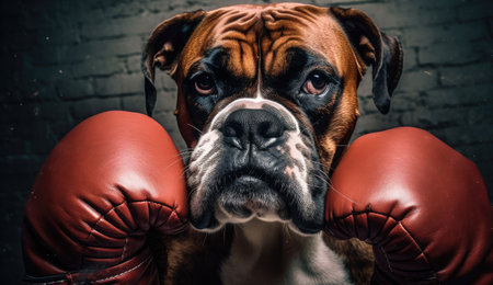 A commanding portrait of a stern Boxer dog, wearing boxing gloves, exuding strength and determination, capturing the essence of fighter generated ai