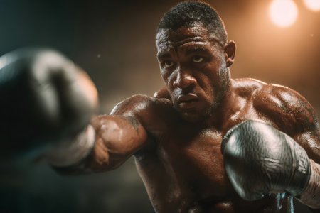 Muscular male boxer training intensely, sweating, and delivering a powerful jab