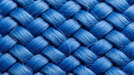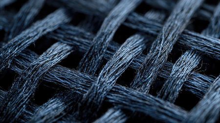 This extreme close-up macro reveals the intricate texture of a deep blue woven fabric. The focuses on the detailed interplay of threads, showcasing the tight weave and the subtle variations in the surface. The rich blue color dominates the frame, creating a visually engaging pattern of interlaced fibers. This abstract representation of textile detail is backgrounds or as a textural in projects, highlighting the fine craftsmanship and the tactile of the fabric.