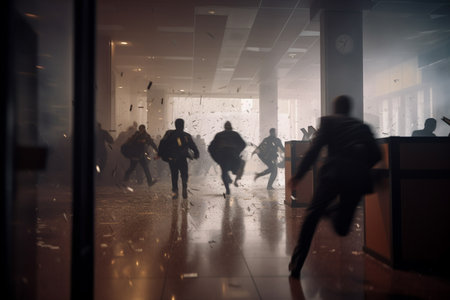 A man walking through a broken glass door. AI generative image.