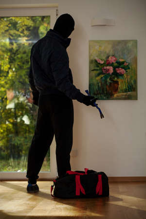 Shot of a burglar stealing a painting from a house