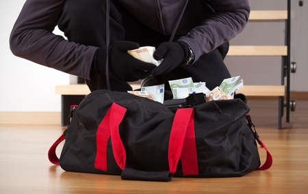 Burglar wearing gloves counting the stolen money