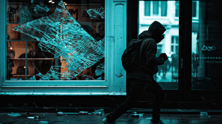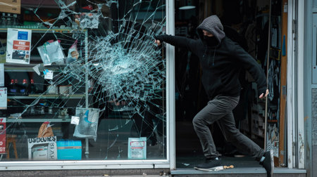 A figure wearing dark clothing and a mask sprinting away from a broken shop window