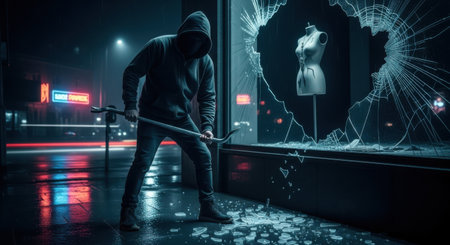 A shadowy figure in a hooded sweatshirt breaks a glass display with a crowbar amidst vibrant city lights.