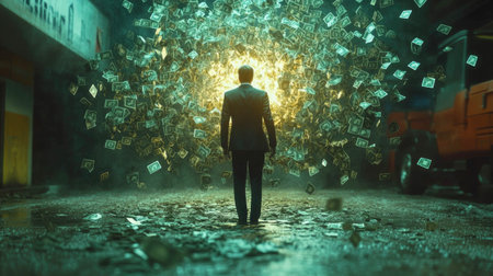 Young businessman surrounded by floating dollar bills, symbolizing wealth, success, and financial prosperity in the corporate and entrepreneurial world.