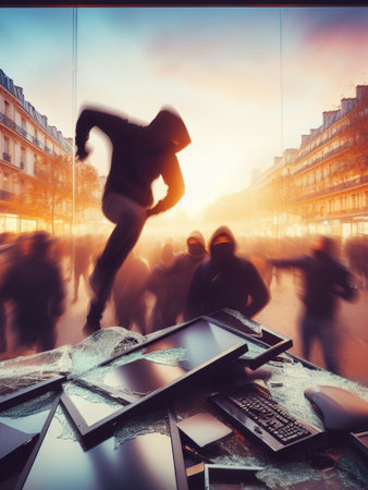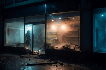 criminal looter rob vandalize retail shop, steal merchandise. graffiti activism paint and break all. High quality photo genertive to art