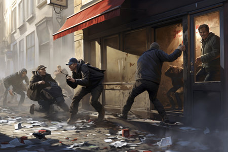 activist crowd, criminal looters vandalize store steal merchandise graffiti paint and break all generative ai art