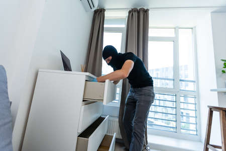Thief with black balaclava stealing modern expensive laptop from apartment. Masked face. Man burglar stealing tv set from house