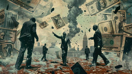 This striking image captures dollar bills swirling amidst torn leaves, symbolizing the chaos of wealth and finance in a modern interior setting.