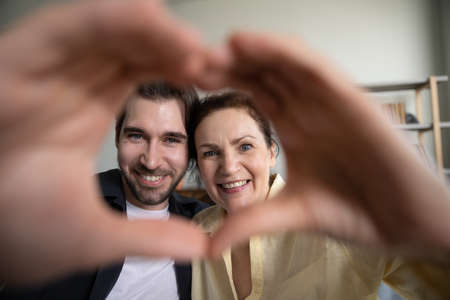Head shot close up happy young caucasian man and joyful middle aged 60s retired mother making heart symbol with fingers, enjoying spending free time together at home, loving family relations concept.