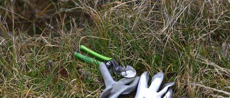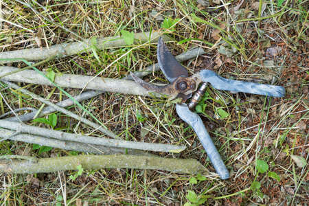 Garden clippers lie on ground after cutting branches. Concept of cutting trees and shrubs.