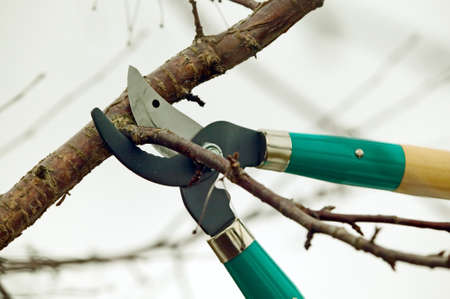 Scissors for cutting branches in the garden, tidying up the garden, cutting old branches in spring, a woman works in an orchard, pruning trees