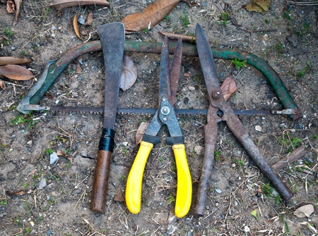 Red garden scissors are on the ground. Because an orchard worker is currently using a saw to remove a large branch.