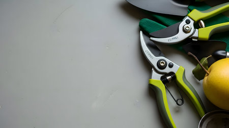 Close-up of garden pruners held against a soft-focus green backdrop, perfect for cutting back flowers and shrubs during spring gardening activities for maintenance.