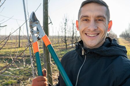 Close up portrait of the happy young man in black jacket and orange gloves stands among his fruitgarden, holds shears in hands, smiling and looking at the camera, sunny day