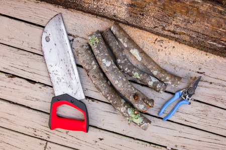 Old rusty handsaw over a wooden boards background, logs of cut firewood and garden pruning shears.