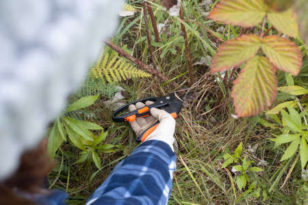 Gardener woman using a garden pruner cuts and rejuvenates a raspberry bush in an autumn garden for a good harvest next year. Close up