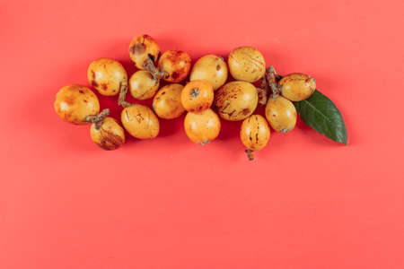 Top view loquats with leaf on light red background. horizontal space for text