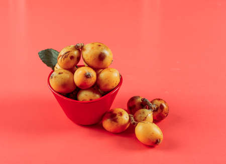 Side view loquats in bowl with leaf on light red background. horizontal space for text