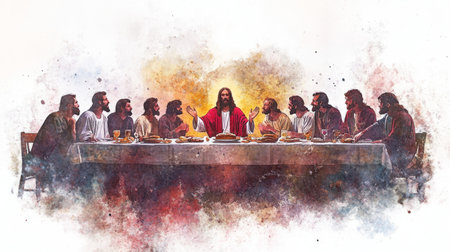 Jesus Christ dining with disciples during the Last Supper at Easter. Concept of holy communion, religious tradition, and dawn of hope. Art