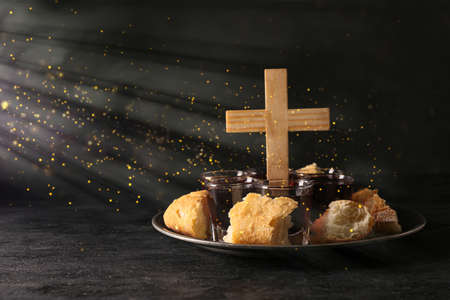 Tray with glasses of wine, bread and cross on dark background. Holy Communion concept