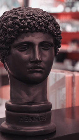 Gypsum copy of ancient statue Hermes head in orange green neon light. Neon image with ancient greek sculpture Hermes head. Minimal art fantasy concept. Copy space