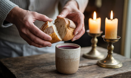 Woman hands breaking rustic artisan bread over a ceramic cup with red wine, flanked by two lit candles on a wooden table, symbolizing communion and faith.