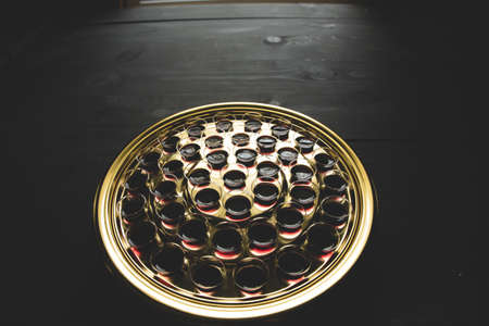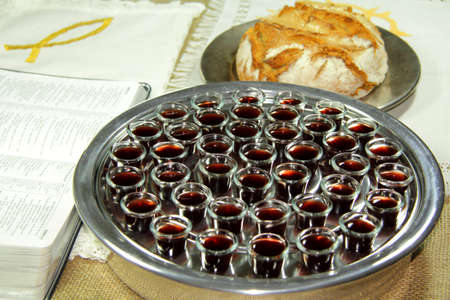 Religious rite: communion. wine, bread. Top view