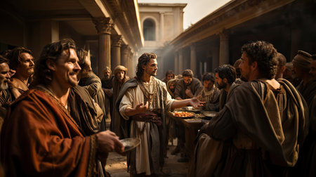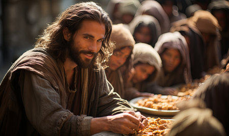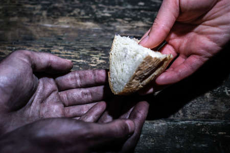 Jesus Christ fed bread to the poor , bible religion, gospels, ancient scriptures history, Jesus hands giving bread to the poor , biblical story to feed hungry, charity
