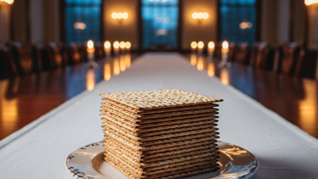 A cinematic wide shot capturing a stack of Matzah crackers on a ceramic plate, positioned centrally
