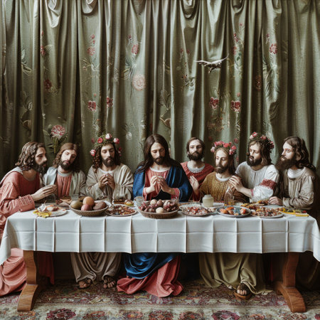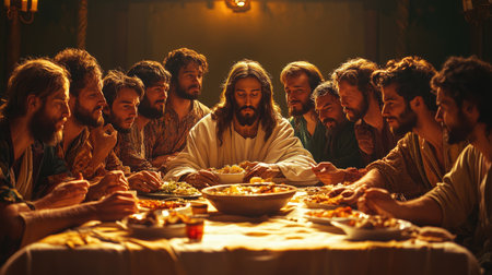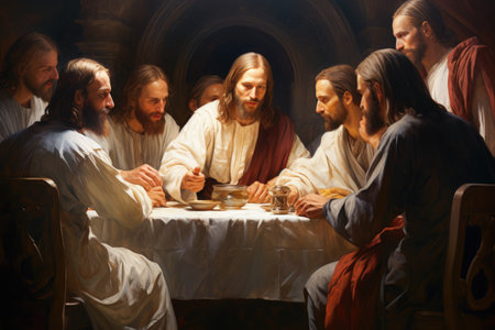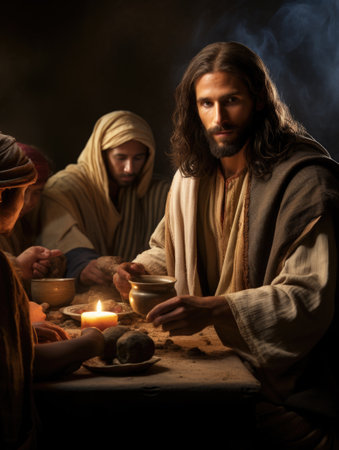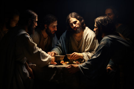 In a moment of profound spirituality, Jesus and his disciples gather around a table, sharing bread and wine, capturing the essence of connection and faith.