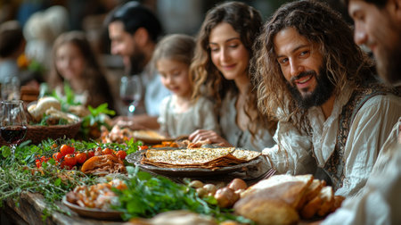 Family members participate Passover Seder engaging traditional foods and reading Haggadah fostering sense unity and honoring their heritage warmly lit setting.