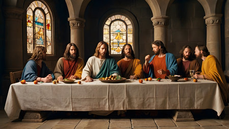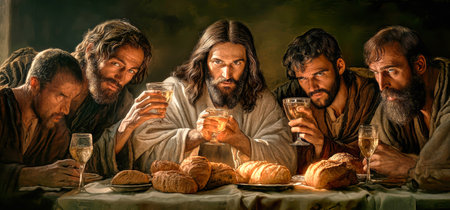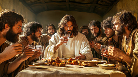 In a sacred moment, Jesus sits at the table during the Last Supper, surrounded by his disciples holding wine and bread, exuding love and spiritual unity.