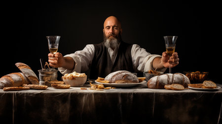 Concept photo of a table adorned with rustic dishes and bread, symbolizing the simple meal of bread and wine shared by Jesus and his disciples